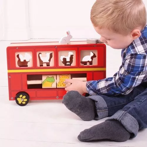 Deze grote, houten dubbeldekker van het merk BigJigs rijdt favoriete dieren door de straten van de stad. De rode speelgoedbus heeft op de bovenste verdieping acht dierenvormen om te ontdekken en mee te puzzelen. De onderste verdieping heeft een schuifsysteem waardoor steeds een ander dier door het raampje gluurt.