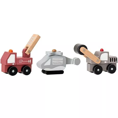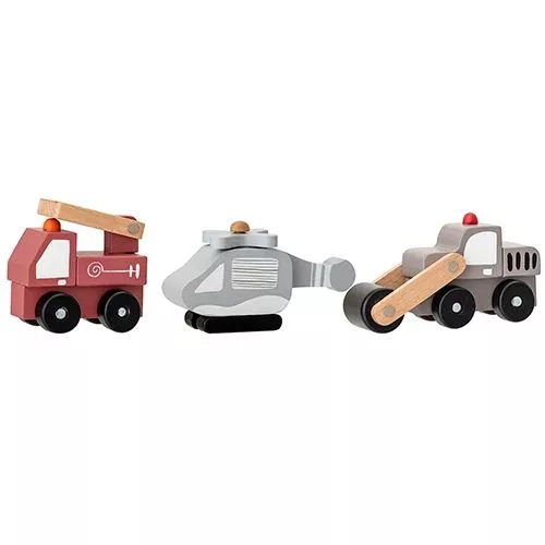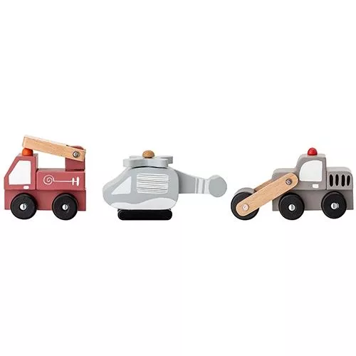 Een set van drie stijlvolle, houten voertuigen van het Deense merk Bloomingville. De brandweer, helikopter en wals hebben elk een bewegend onderdeel.