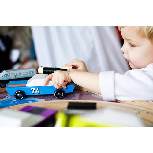 Deze speelgoedauto ‘Blue74 Racer’ van het Amerikaanse merk Candylab is de ster van iedere racebaan. De houten raceauto is een echte snelheidsduivel, die door een simpel maar uiterst sterk ontwerp meteen doet denken aan de klassieke racewagens uit vervlogen tijden. Designerspeelgoed voor de echte autoliefhebber.