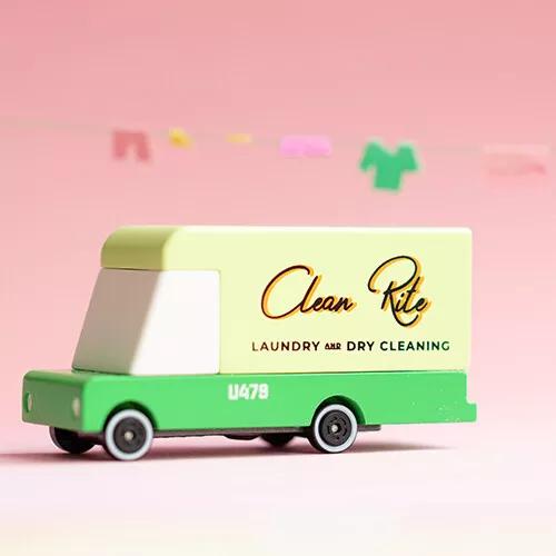Tuut tuut! Deze speelgoedauto ‘Laundry Van’ van het Amerikaanse merk Candylab komt de schone was brengen. Deze groen-crème kleurige bus is door zijn opvallende uiterlijk van ver af te zien.