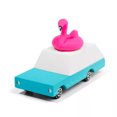 Deze speelgoedauto ‘Candycar – Flamingo Wagon’ van het Amerikaanse merk Candylab maakt een spetterende indruk op de autobaan.