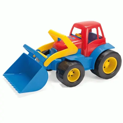 Met de beweegbare voorlader is het speelgoed goed voor de oog-handcoördinatie. De rubberen wielen dempen enigszins het geluid.