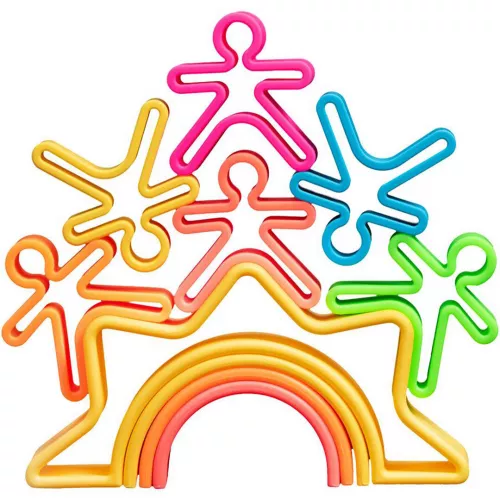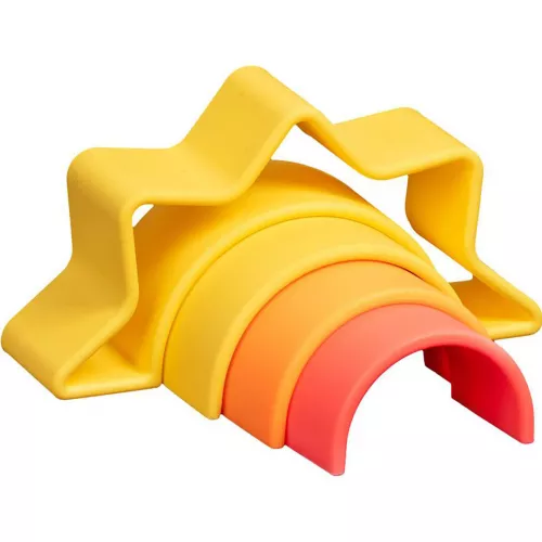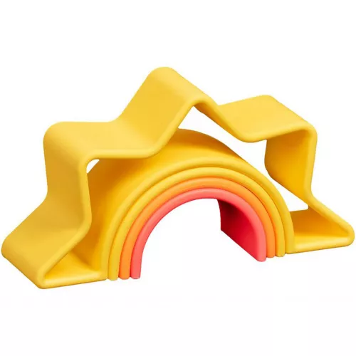 Deze neon regenboog en zon speelset van het Spaanse merk Dëna is veelzijdig open ended speelgoed waar op allerlei manieren mee gespeeld kan worden. Van bijtspeeltje voor de allerkleinsten tot stapelspeelgoed voor de grotere kinderen.