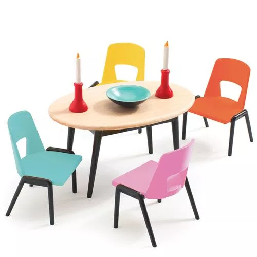 De speelgoed meubelset bestaat uit een ovale eettafel, 4 eetstoelen in verschillende kleuren en accessoires.