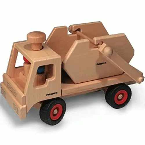 Een houten vrachtauto met container van het Duitse merk Fagus met een open laadbak, waar een container op geplaatst is, die beweegbaar is en 2 gestileerde poppetjes. De container kan erop en eraf gehaald worden.