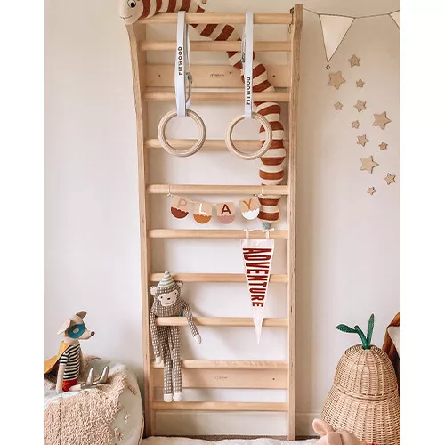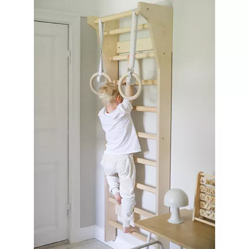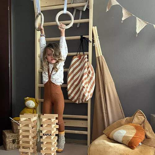 De houten turnringen UPLU MINI zitten niet inbegrepen bij het klimrek, deze zijn los verkrijgbaar.