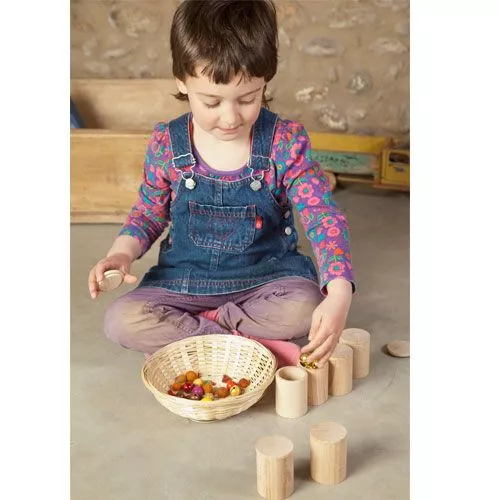 Een set van 6 houten ronde potjes met dekseltjes ‘Cubilets cru amb tap’ van het Spaanse merk Grapat, geschikt voor allerlei speelmogelijkheden en leermomenten. Voor de allerkleinsten boeiend speelgoed! Past alles erin wat de dreumes erin wil hebben? Een stimulans voor begrippen als groot en klein, veel en weinig. De potjes kunnen gestapeld worden en er kunnen schatten in bewaard worden.