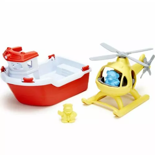 Een stoere set van twee voertuigen van het merk Green Toys™. Kapitein Eend en piloot Beer kennen geen angsten! Trotseer samen met deze onverschrokken helden de woeste zeeën om mensen in nood te redden. Kan de boot er niet bij door de wilde zee? Hopelijk kan de helikopter een handje helpen!