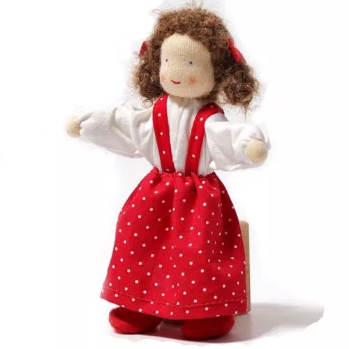 Dit meisje Lena met bruin haar van het Duitse merk Grimm’s is een prachtig handgemaakt poppenhuispopje. Ze heeft een zacht lichaampje met beweegbare armen en benen. Haar gezichtje is met de hand geschilderd, waardoor elk poppetje een unieke expressie heeft. Haar krullende donkere lokken, lieve lach en kleurige kleding maakt haar al snel een favoriet.