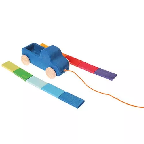 Een robuuste blauwe vrachtwagen als trekfiguur, met 10 plankjes in de kleuren van de regenboog van het Duitse merk Grimm’s.