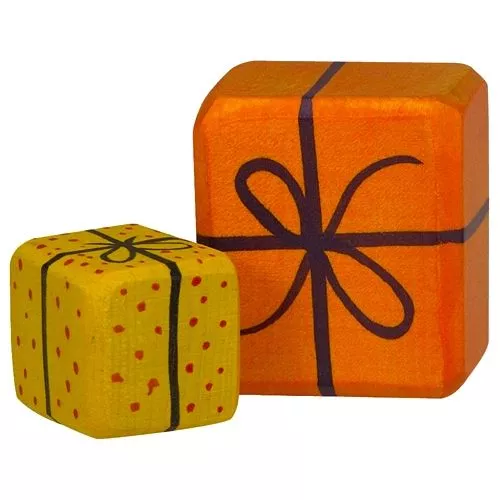 Twee houten blokjes beschilderd als cadeau’s uit de kerstmis serie van het Duitse merk Holztiger. De speelgoedblokjes kunnen deel uitmaken van een kerst- of sinterklaastafereel, een seizoenstafel of dienst doen als decoratie in huis. De houten speelgoedcadeau’s liggen door hun afgeronde hoeken prettig in kinderhanden.