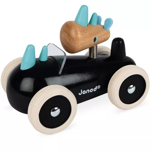 De speelauto heeft een klassiek en stijlvol design en wordt bestuurd door een neushoorn met vilten oren. Deze bestuurder is voor een speels effect aan de auto gemonteerd met een springveer.
