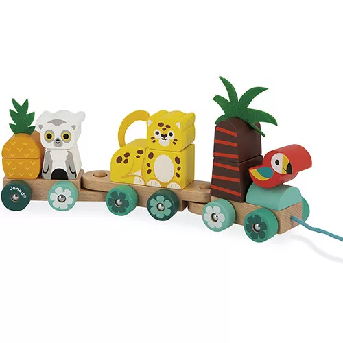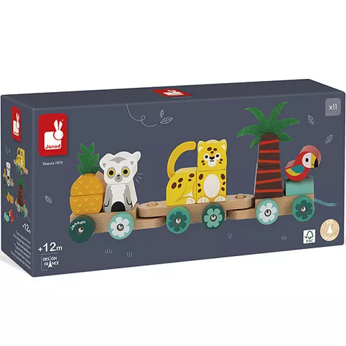 Spring op de trein met deze dierenvrienden! Dit houten trekfiguur ‘Tropik’ met drie tropische passagiers van het Franse merk Janod is klaar om te vertrekken. Met de blokken in verschillende kleuren en vormen, kunnen jonge peuters hun eigen wagons maken.