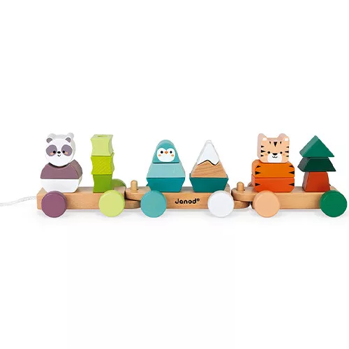 Spring op de trein met deze dierenvrienden! Deze houten trekfiguur ‘Train la balade des animaux – partenariat WWF’ van het Franse merk Janod, met drie passagiers is klaar om te vertrekken. Met de blokken in verschillende kleuren en vormen, kunnen verschillende wagons gemaakt worden. Gebruik het touwtje aan de voorkant om de speelgoedtrein mee te trekken op de leukste avonturen!