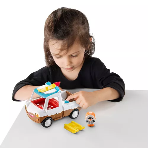 De speelauto is makkelijk te openen voor kinderen: zij drukken simpelweg op het dak en de bus springt open.
