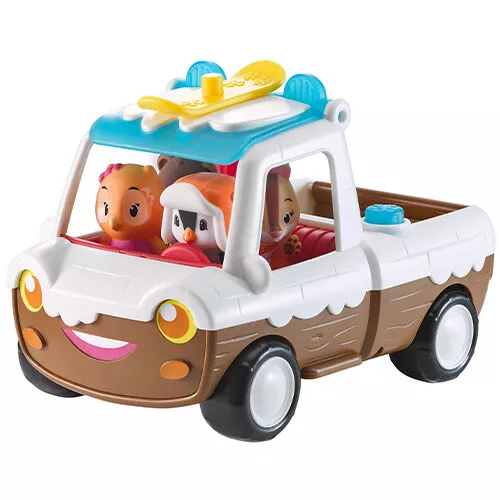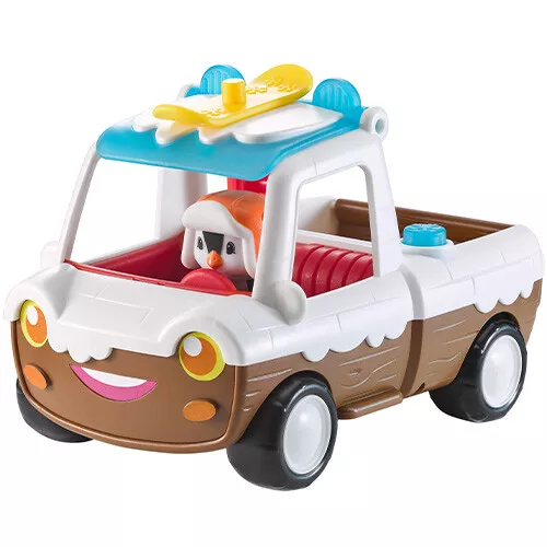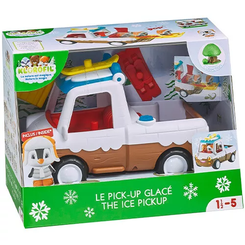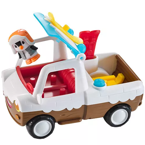 Een robuuste speelgoedauto ‘Winter Pickup’ van het Franse merk Klorofil om de Klorofil figuurtjes in te vervoeren tijdens hun ski-vakantie. De bestuurder van de grote speelauto is een vrolijke pinguïn. In zijn pickup is plek voor vier passagiers. Zowel op het dak als in de achterbak is er ruimte voor een snowboard of ski’s.