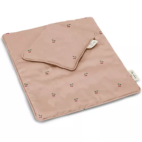 Poppen en knuffels zijn verzekerd van een goede nachtrust onder dit katoenen poppendekbed met kussentje ‘Cherry Blush’ van het Deense merk Konges Sløjd. Het poppenbeddengoed met kersen is afgewerkt met een biesje.