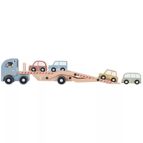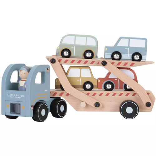 Klap de oplegger uit, rijd de auto’s op deze stevige, houten speelgoedtruck van het Nederlandse merk Little Dutch en ga op weg.