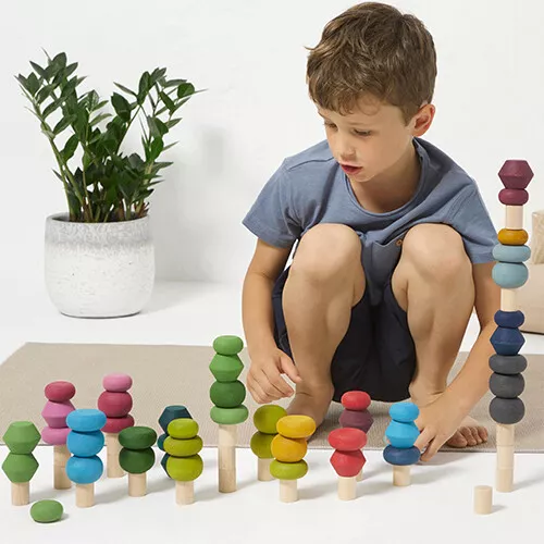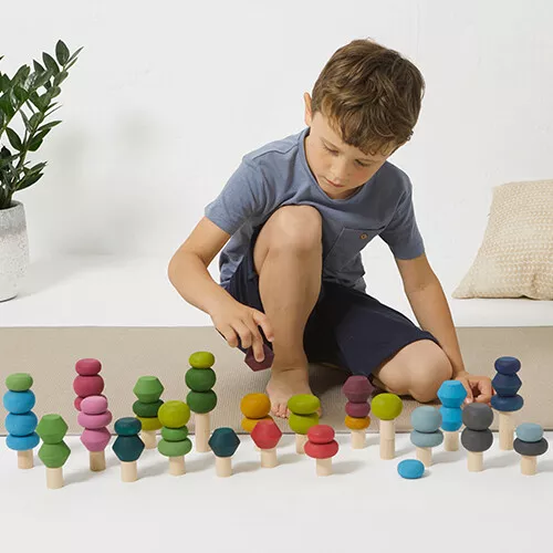 Een set met vier houten stapelbomen ‘Winter Stacking Trees’ van het Spaanse merk Lubulona. Stapelspeelgoed waarmee decoratieve zuilen gevormd kunnen worden, of grote of kleine bomen, als onderdeel van een stads tafereel of landschap.