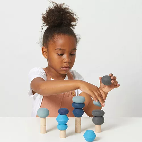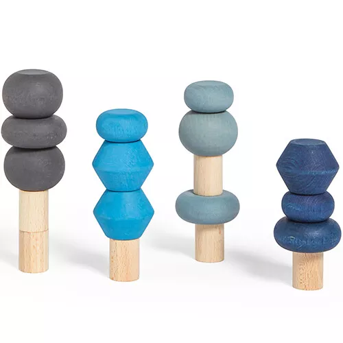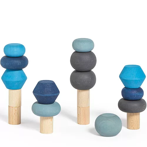 Het open-ended speelgoed heeft koele winterkleuren. De verschillende vormen maken het speelgoed uniek en uitdagend en biedt ruimte aan de verbeelding.