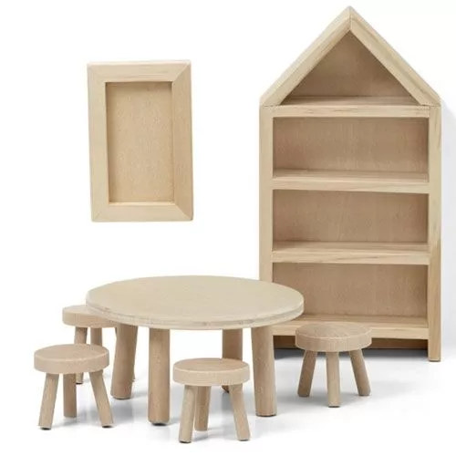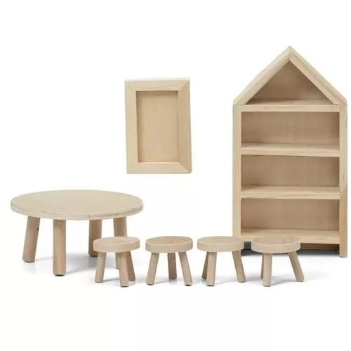 Een houten poppenmeubelset voor kleine meubelmakers en houtbewerkers van het Zweedse merk Lundby om zelf, of onder toezicht, naar hartenlust te beschilderen en te versieren, bestaande uit: