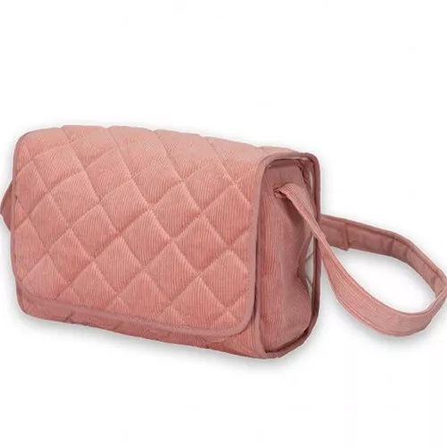 Een uitgebreide poppenluiertas ‘Nursery Bag Corduroy Rose’ van corduroy van het Deense merk Mama Memo. Deze speelgoedtas bevat alles wat poppenouders nodig hebben om samen met hun lievelingspop of -knuffel op pad te gaan: een poppenluier, poppenslabbetje en poppendoek. De tas heeft een extra lange sluitflap waar de pop of knuffel op verschoond kan worden.