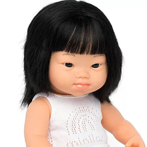 Deze hartveroverende babypop van het Spaanse merk Miniland heeft een mollig, anatomisch correct meisjeslijfje en gezichtje met de herkenbare trekken van een kindje met het syndroom van Down. Ze heeft sprekende, donkere ogen en een prachtige bos zwart haar.