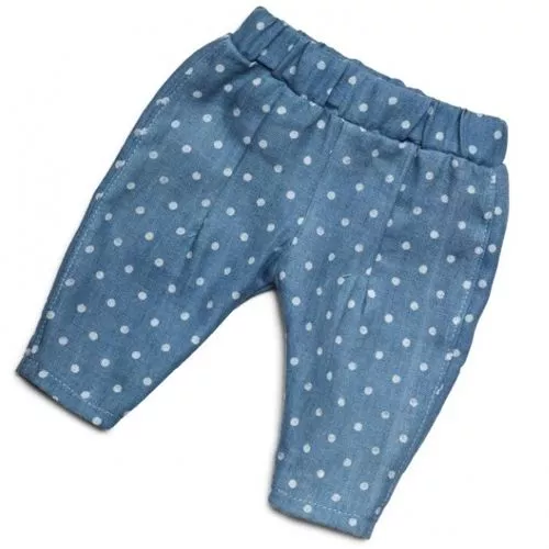 Een blauwe poppenbroek met witte stippen van fijne stretchstof en een grijs t-shirt met pofmouwen en bloemetjes van het Zweedse merk Skrållan.