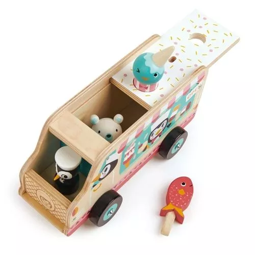 Een ijskraam op wielen! Deze kleurrijke houten speelgoedauto ‘Wooden Penguin’s Gelato Van’ van het Engelse merk Tender Leaf Toys heeft wel drie verschillende soorten ijsjes in de aanbieding en wordt bestuurd door een vrolijke pinguïn.