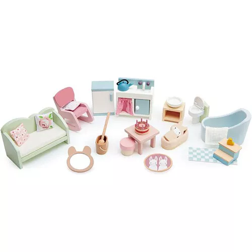 Een stijlvolle houten meubelset ‘Countryside Furniture Set’ met 24 accessoires van het Amerikaanse merk Tender Leaf Toys voor de complete inrichting van het lieflijke poppenhuis. De poppenmeubels stralen een knusse sfeer uit, perfect voor het huis van een poppenfamilie