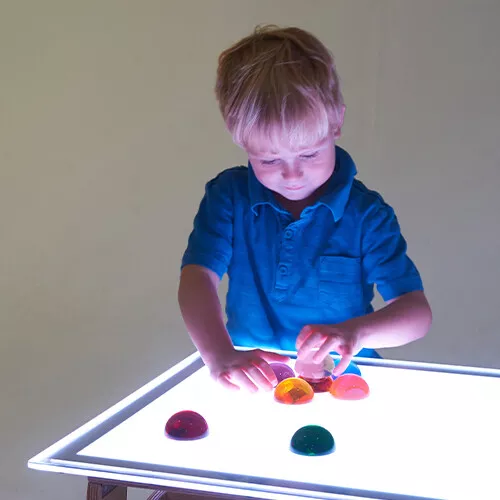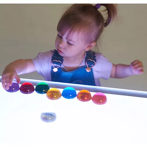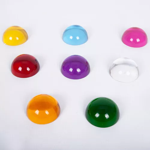 Houd verschillende kleuren tegen elkaar, zodat er nieuwe kleuren ontstaan en gebruik de halve bollen met een zaklamp, lichtbak of in de zon voor een verrassend effect.