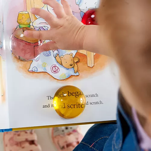 De gladde speelgoedbollen voelen interessant aan en zijn dankzij het transparante materiaal fascinerend om mee te spelen. Ook hebben ze een vergroting van vier tot vijf keer om objecten te onderzoeken en van dichtbij te bekijken.