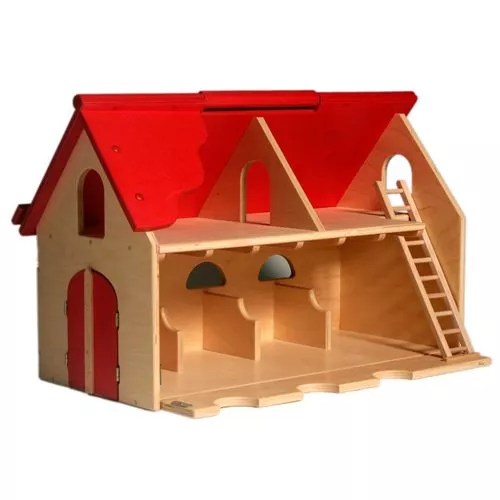 Een ijzersterke houten speelboerderij van het Nederlandse merk Van Dijk Toys. De kleine boer heeft in deze stal ruimte voor zijn koeien en paarden en ook op zolder kan hij nog dieren herbergen! De boerderij heeft een scharnierend dak en een ladder.